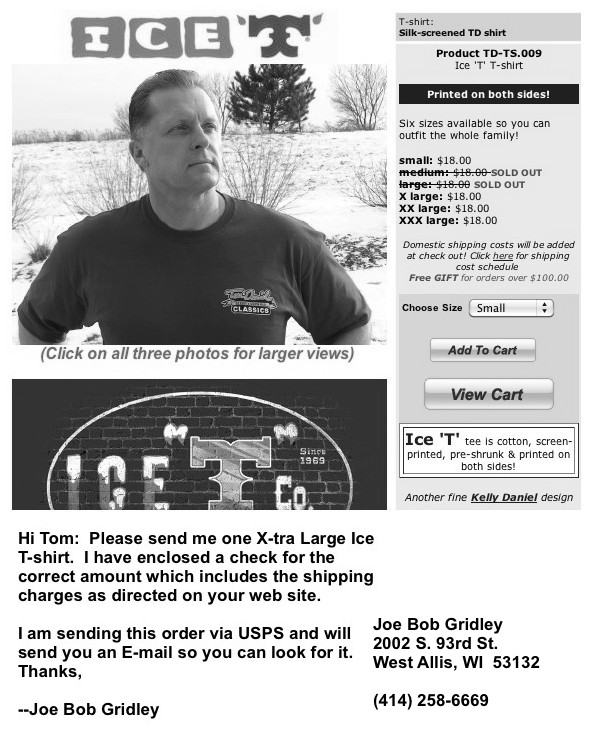 Print out that page directly from your browser to your printer. If you want more than one of this item, be sure sure to tell Tom that in your message. Also remember to write your shipping address on the printed page (consider giving Tom your phone number as well.) You can then find other items in the TD store and print them out too. Combine many items in one off-line purchase. |